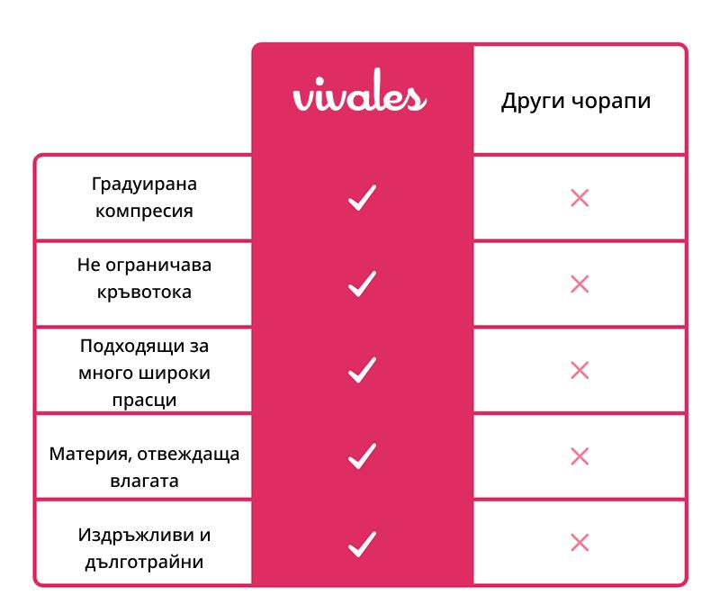 Компресионните чорапи Vivales използват градирана компресия 15–20 mmHg, за да намалят подуването.