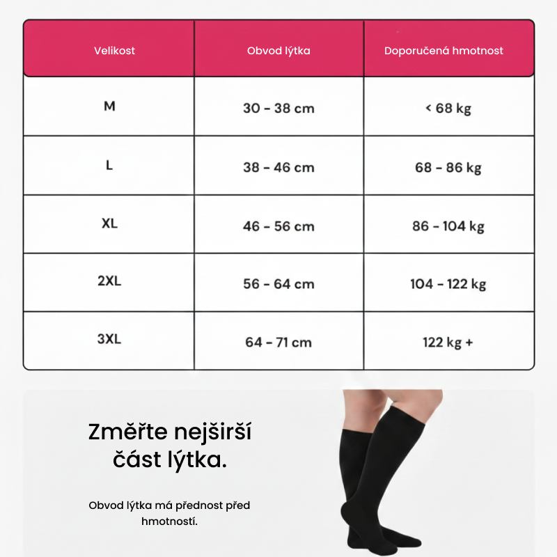 Naše ponožky sedí pohodlně bez ohledu na otoky nohou. Díky velikostem pro lýtka od 30 do 71 cm najdeš padnutí, které ti bude přesně vyhovovat.