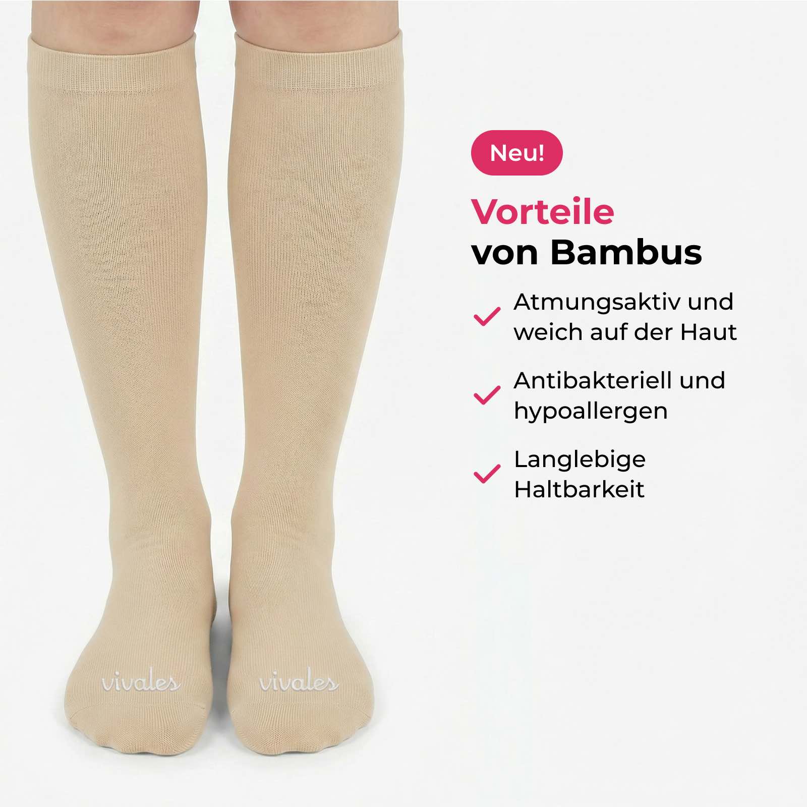 Das atmungsaktive, bambusreiche Strickmaterial fühlt sich angenehm auf der Haut an und hilft, Schwellungen, Schweregefühl und tägliche Beinbeschwerden zu reduzieren – damit sich deine Beine schon beim ersten Tragen leichter, entspannter und besser gestützt anfühlen.