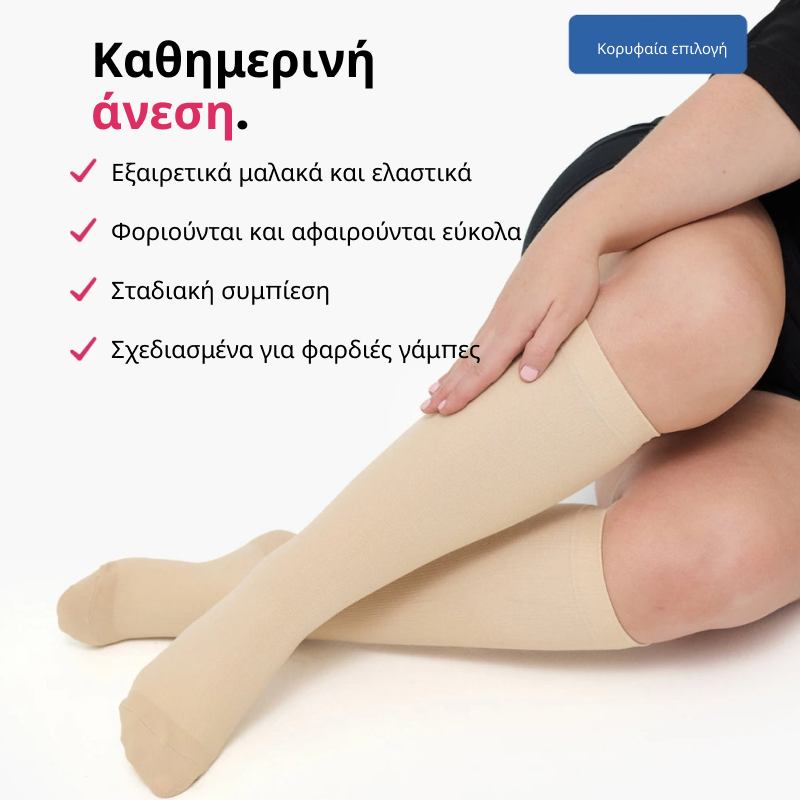Σε αντίθεση με άλλες μάρκες που είναι είτε πολύ σφιχτές, δύσκολες να φορεθούν ή άβολες, οι δικές μας κάλτσες είναι σχεδιασμένες για εύκολη εφαρμογή, προσφέροντας άνεση και αποτελεσματική ανακούφιση.