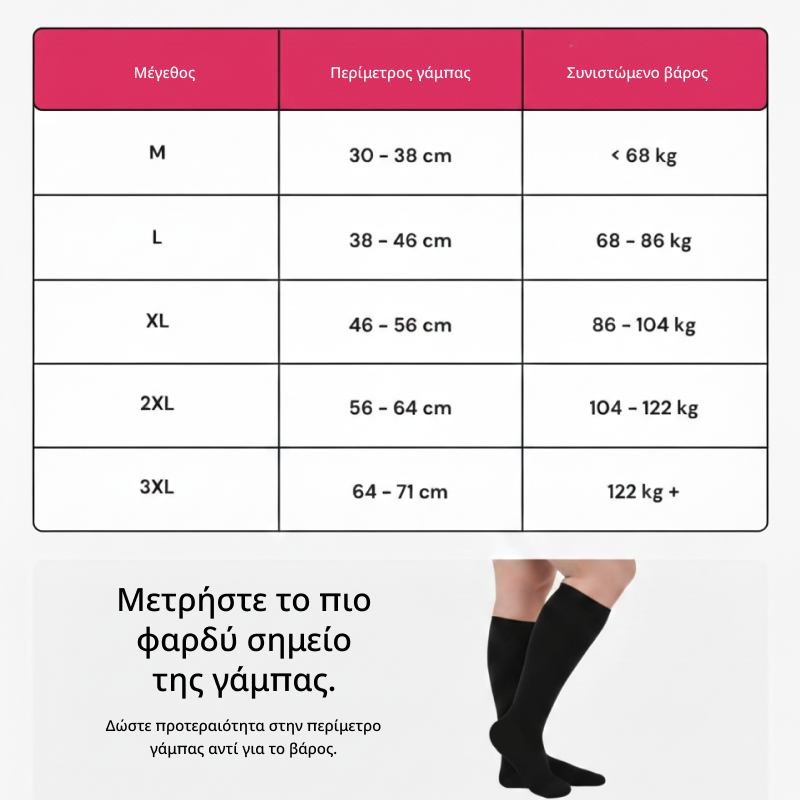 Οι κάλτσες μας εφαρμόζουν άνετα, όσο κι αν είναι πρησμένα τα πόδια σου. Με μεγέθη για γάμπες από 30 έως 71 εκ., θα βρεις την εφαρμογή που σου ταιριάζει απόλυτα.