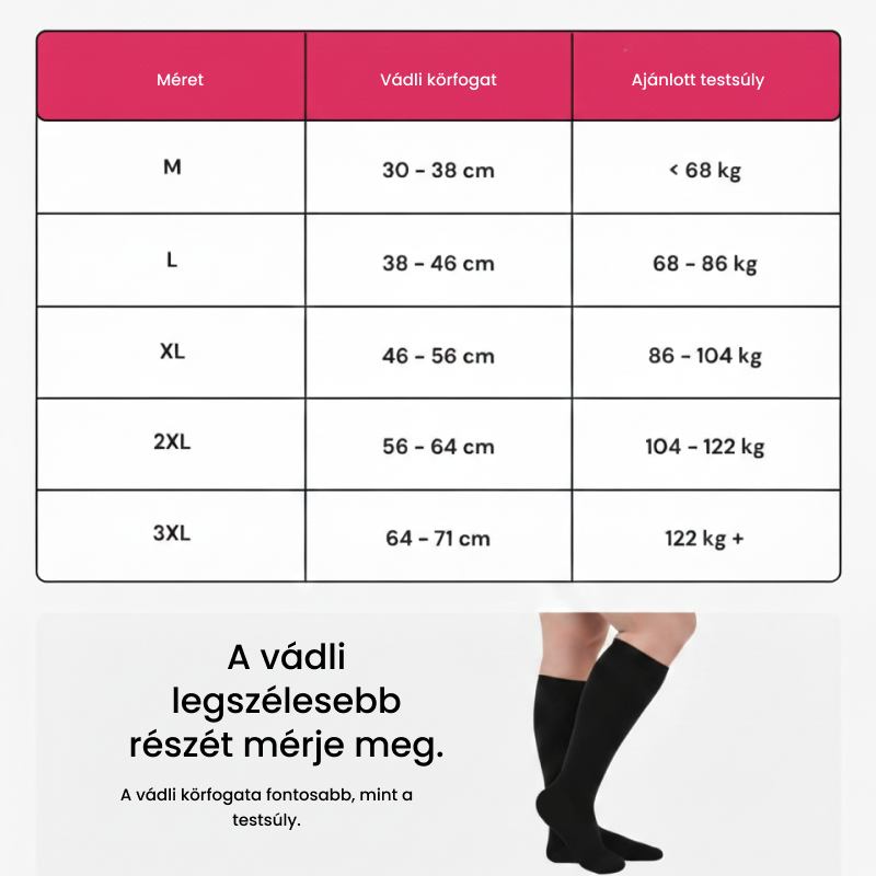 Zoknijaink kényelmesen illeszkednek, bármennyire is dagad a lábad. A 30–71 cm-es vádlira készült méretek között biztosan megtalálod a tökéleteset.