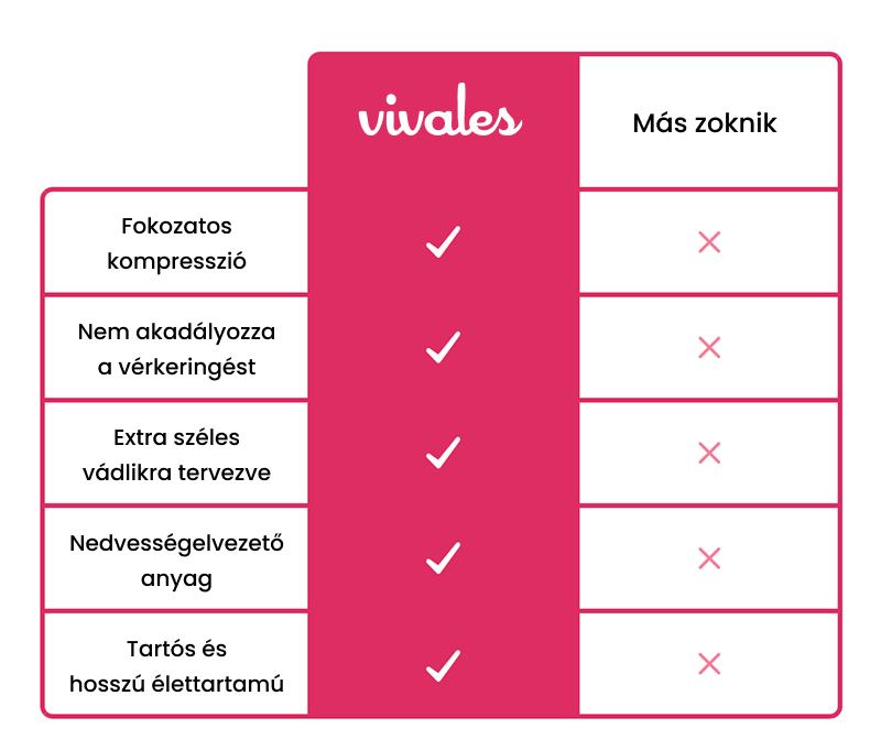 A Vivales kompressziós zoknik 15–20 mmHg fokozatos nyomást alkalmaznak a dagadás csökkentésére.
