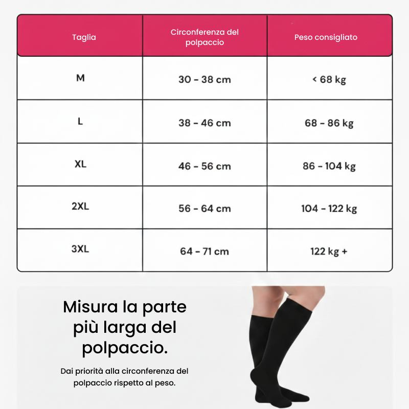 Le nostre calze offrono comfort anche con gambe gonfie. Con taglie adatte a polpacci da 30 a 71 cm, troverai sempre la vestibilità perfetta.