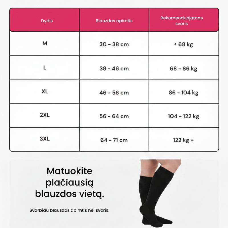Mūsų kojinės patogiai priglunda, kad ir kiek būtų patinusios kojos. Dydžiai tinka blauzdoms nuo 30 iki 71 cm – rasite sau tinkamą.