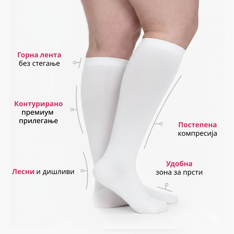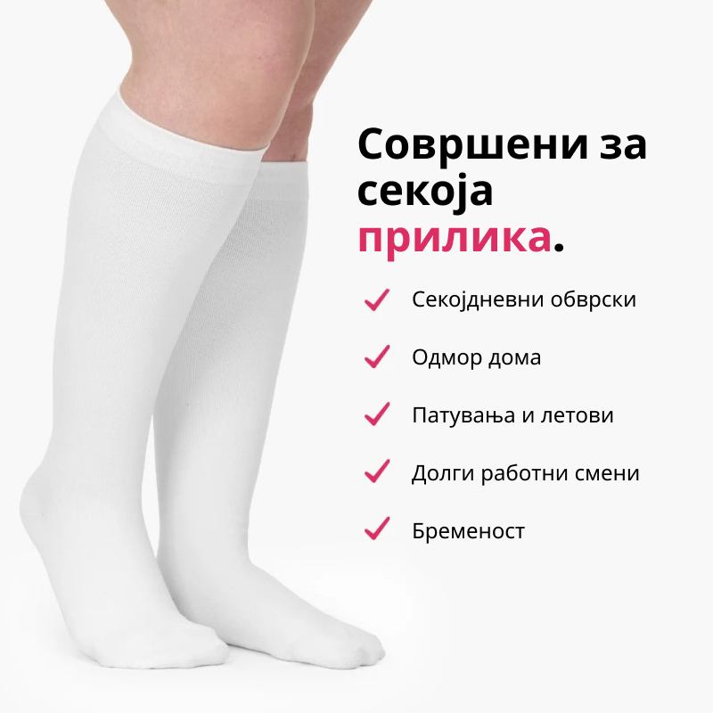 Со градуирана компресија, чорапите ја подобруваат циркулацијата, ја намалуваат болката, го ублажуваат заморот и го олеснуваат чувството на тежина.