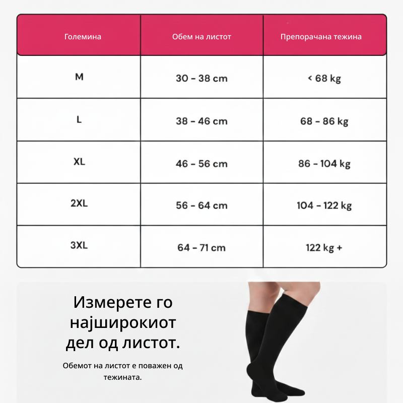 Нашите чорапи стојат удобно без разлика колку ти се отечени нозете. Со големини за листови од 30 до 71 cm, ќе најдеш совршено вклопување.