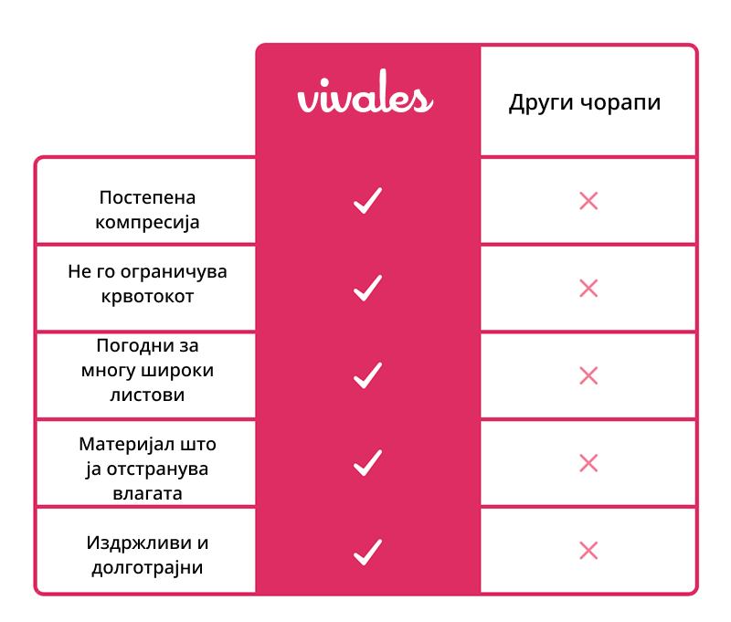Облекувањето чорапи не треба да биде тешка задача. Затоа чорапите Vivales се направени од супереластична ткаенина што лесно се облекува и соблекува.