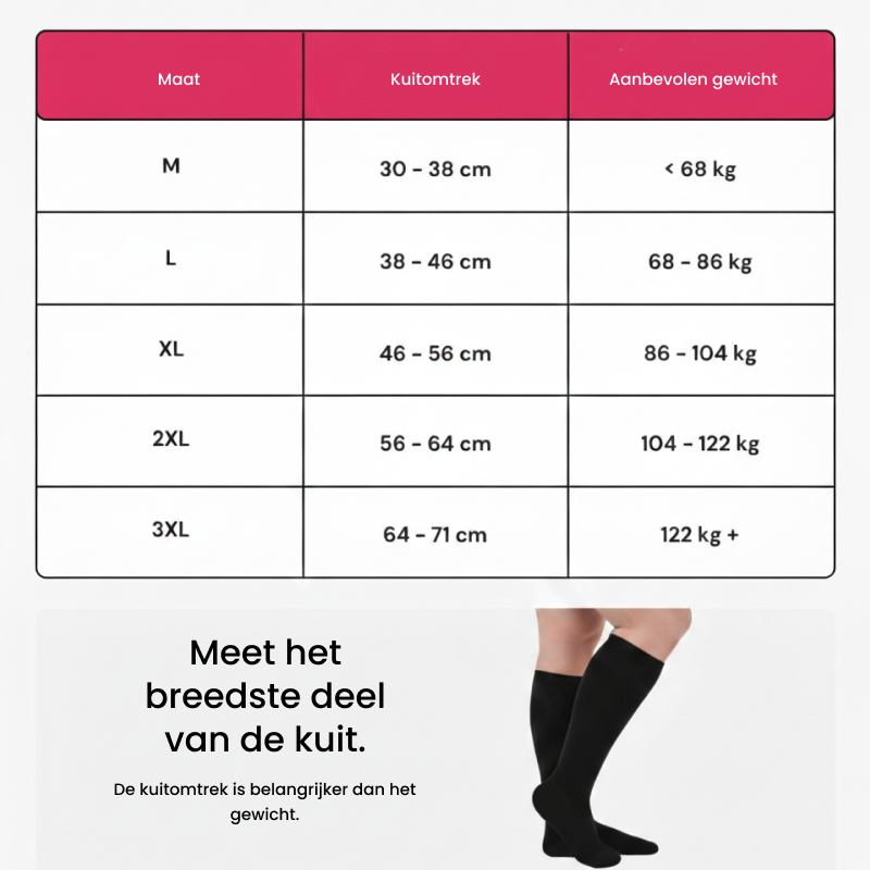 Onze sokken zitten comfortabel, hoe gezwollen je benen ook zijn. Met maten voor kuiten van 30 tot 71 cm vind je altijd de juiste pasvorm.