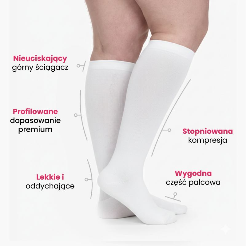 Zapewniają delikatny, stopniowany ucisk, który poprawia krążenie, zmniejsza opuchliznę i łagodzi dyskomfort.