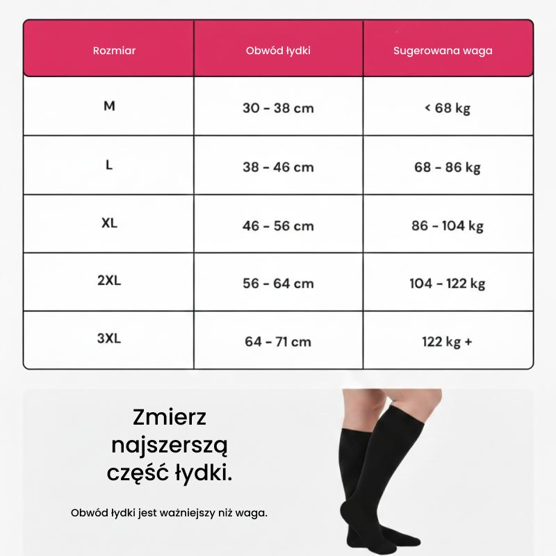 Nasze skarpety zapewniają wygodę niezależnie od stopnia opuchnięcia nóg. Dzięki rozmiarom na łydki od 30 do 71 cm znajdziesz idealne dopasowanie.