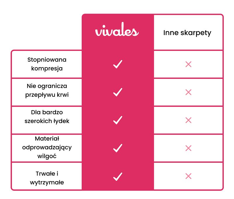 Skarpetki uciskowe Vivales wykorzystują stopniowany ucisk 15–20 mmHg, aby zmniejszyć obrzęki.