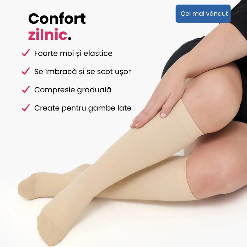 Șosetele noastre sunt special concepute pentru gambe late, oferind o compresie ușoară și plăcută, care nu limitează mișcarea și nu întrerupe circulația. Ca să te simți bine în fiecare zi.
