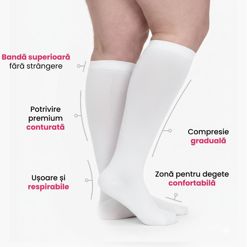 Da! Șosetele noastre compresive sunt concepute pentru a fi ușor de purtat. Sunt moi, elastice și realizate special pentru gambe mai late.