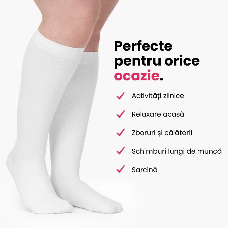 Da, șosetele noastre compresive sunt perfecte pentru zboruri lungi! Ajută la îmbunătățirea circulației, reduc umflarea și previn disconfortul în perioadele lungi de stat pe scaun.